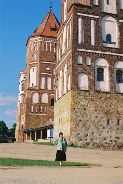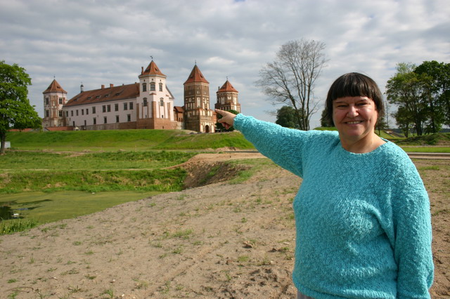 Picture of Maria pointing to her ancestra home of Mir Castle